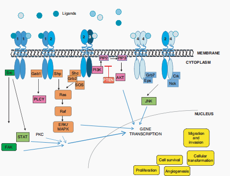 ზრდის ფაქტორთა რეცეპტორები სამი ნაწილისაგან შედგება უჯრედგარე, უჯრედშირისი (ტრანსმემბრანული) და უჯრედშიდა დომენებისაგან.უჯრედგარე დომენთან ლიგანდის მიერთების შემდეგ ხდება რეცეპტორთა დიმერიზაცია და მათი უჯრედშიდა დომენები ტრანსფოსფორილირებას იწყებს რის შემდეგაც იმატებს უჯრედშიდა დომენის უარყოფითი მუხტი და რეცეპტორის კატალიზური დომენი იძენს ადაპტორული ცილების მიერთების უნარს. ადაპტორული ცილები SH2 რეგიონის შემცველი ციტოპლაზმური ცილებია რომლებიც აგრძელებენ ბიოლოგიური ინფორმაციის გადაცემის პროცესს.ადაპტორული ცილები თიროზინკინაზური რეცეპტორების დომენებს სწორედ SH2 რეგიონის საშუალებით ამოიცნობს.ადაპტორულ ცილას რეცეპტორთან მიერთების შემდეგ კონფორმაცია ეცვლება თუ ის ფერმენტია იცვლება მისი აქტივობაც.დღესდღეისობით მრავალი ადაპტორული ცილაა აღმოჩენილი თუმცა ფერმენტული აქტივობა მხოლოდ ფოსფოლიპაზა CY გააჩნია ამ ცილას MAP კასკადში ჩართვის პარალელურად შეუძლია TPI და DAG წარმოქმნა ამიტომ ზრდის ფაქტორთა აქტივაციას ხშირ შემთხვევაში უჯრედში კალციუმის კონცენტრაციის მატება ახლავს თან.